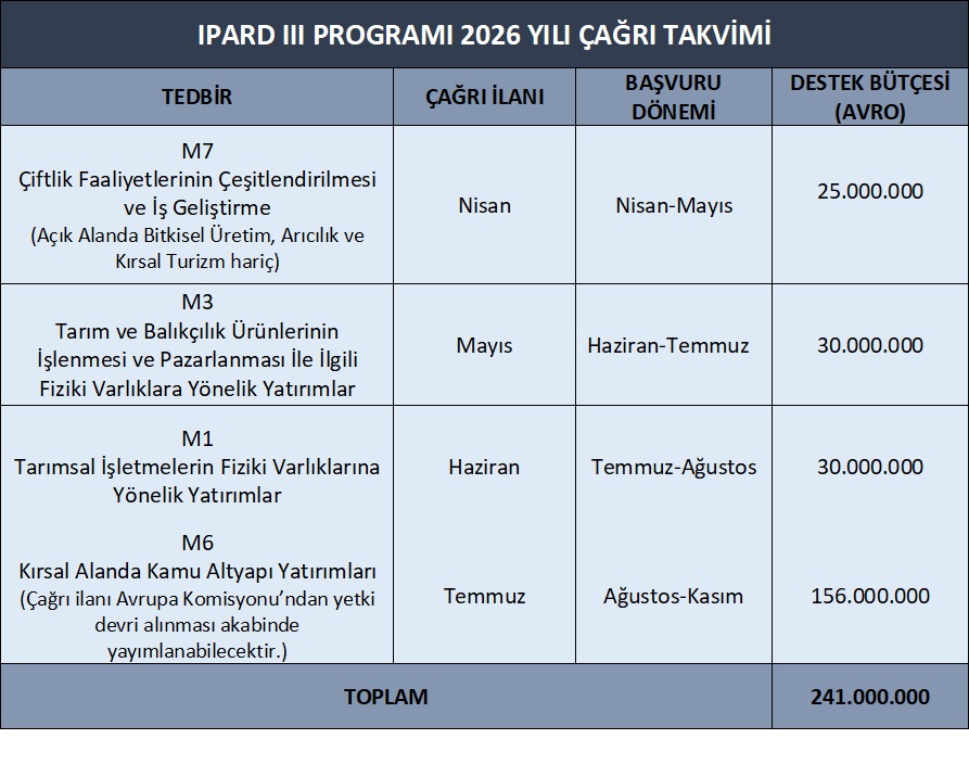 IPARD III Programı kapsamında açıklanan 2026 yılı çağrı takvimine göre; 241 Milyon Avro tutarında hibe desteği için dört farklı tedbirden başvuru çağrı ilanına çıkılacaktır.